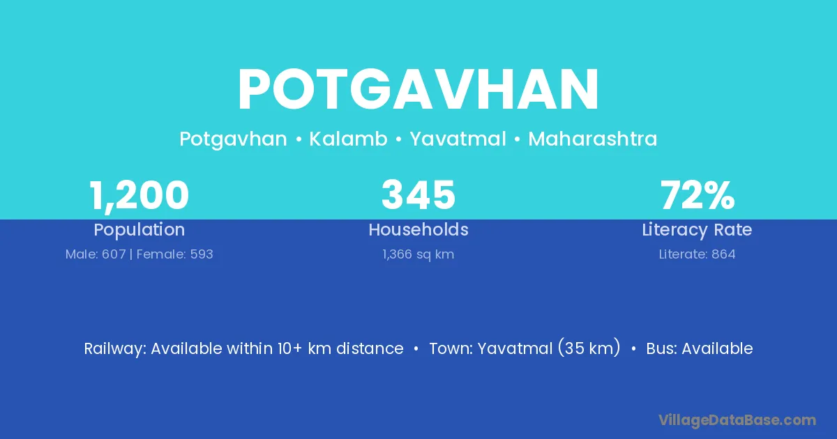 Yavatmal (35 km) is the nearest town to Potgavhan village for major economic activities and is located approximately 35 km away.