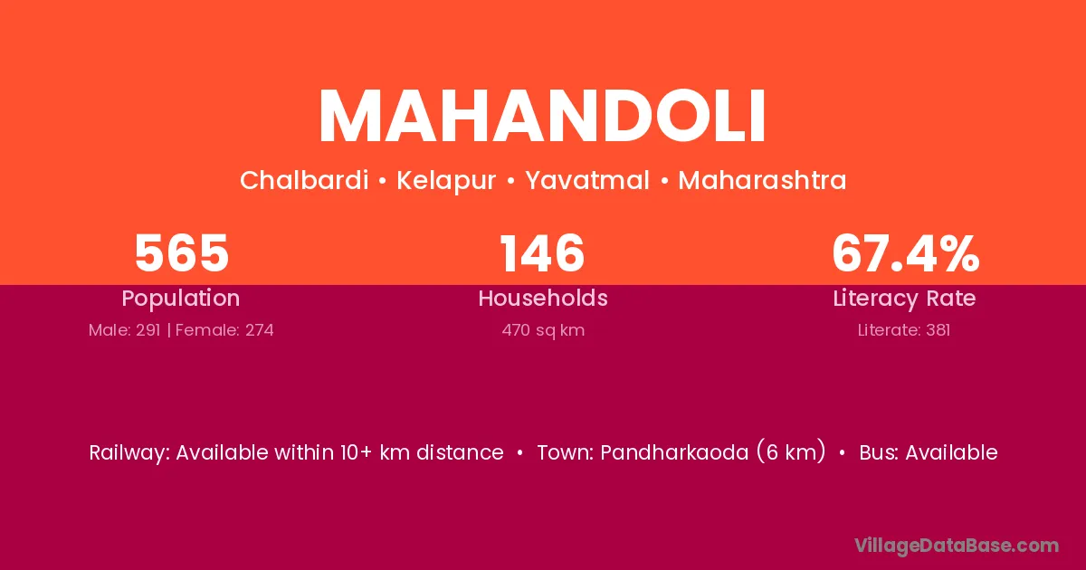 Pandharkaoda (6 km) is the nearest town to Mahandoli village for major economic activities and is located approximately 6 km away.