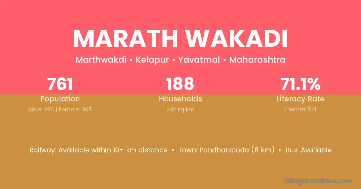 Pandharkaoda (8 km) is the nearest town to Marath Wakadi village for major economic activities and is located approximately 8 km away.
