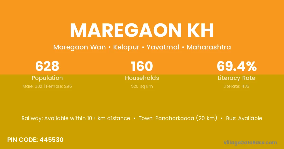 Pandharkaoda (20 km) is the nearest town to Maregaon Kh village for major economic activities and is located approximately 20 km away.