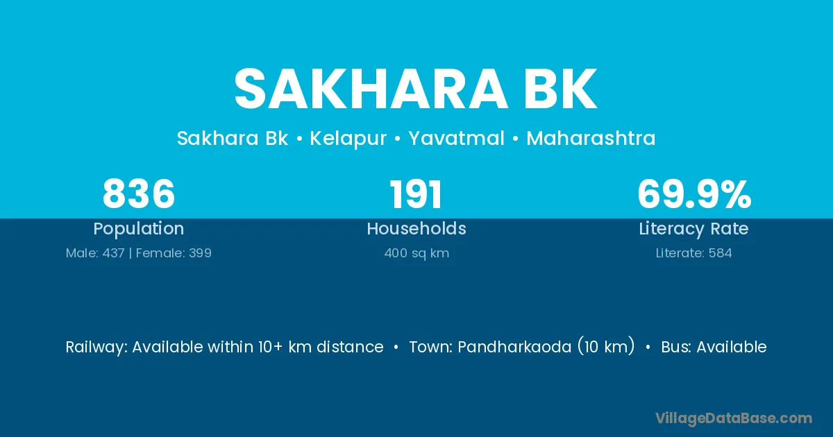Pandharkaoda (10 km) is the nearest town to Sakhara Bk village for major economic activities and is located approximately 10 km away.