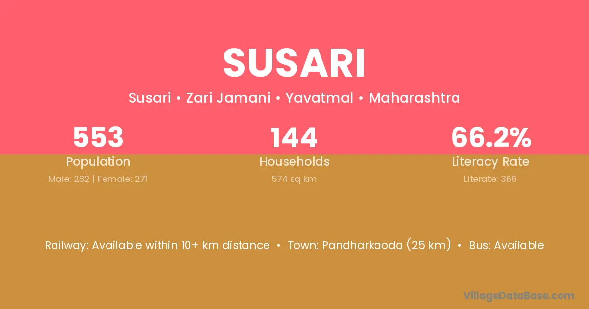 Pandharkaoda (15 km) is the nearest town to Susari village for major economic activities and is located approximately 15 km away.