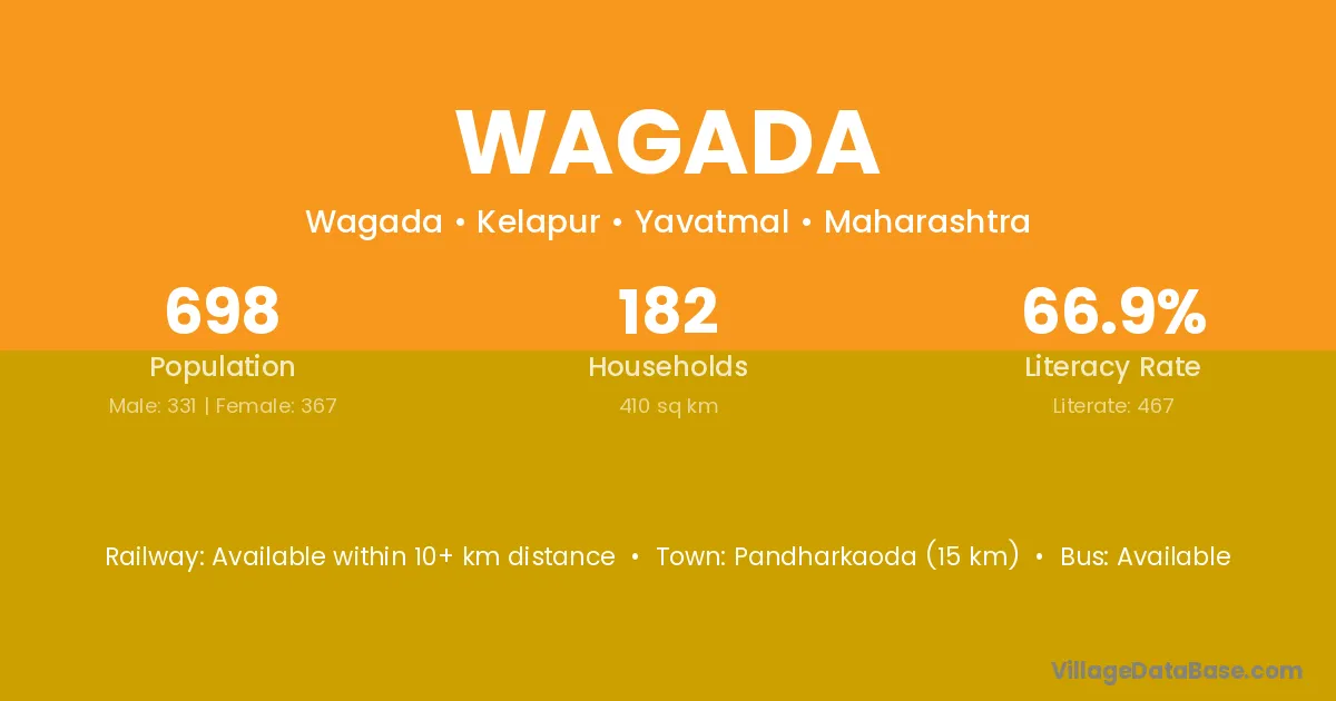 Pandharkaoda (15 km) is the nearest town to Wagada village for major economic activities and is located approximately 15 km away.
