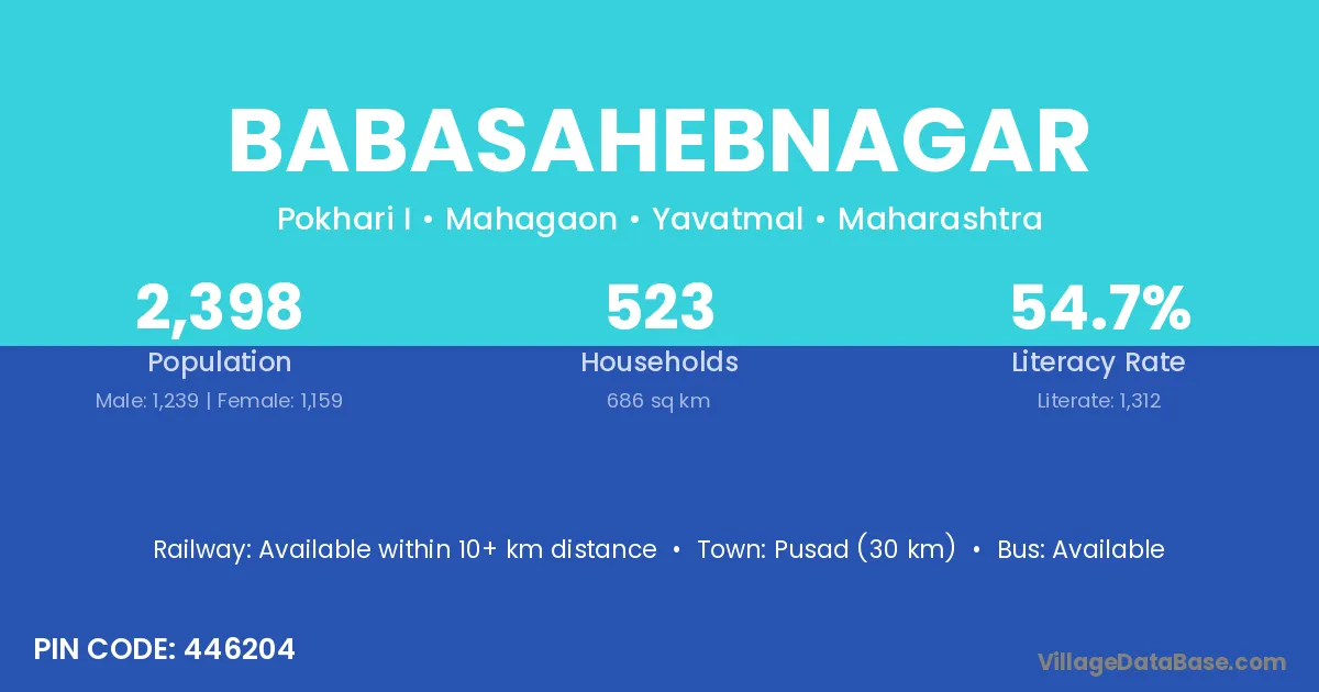 Pusad (30 km) is the nearest town to Babasahebnagar village for major economic activities and is located approximately 30 km away.