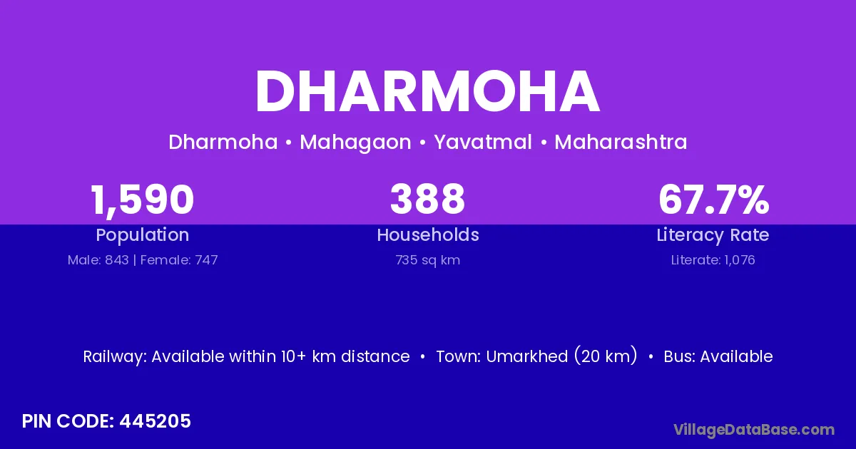 Umarkhed (20 km) is the nearest town to Dharmoha village for major economic activities and is located approximately 20 km away.
