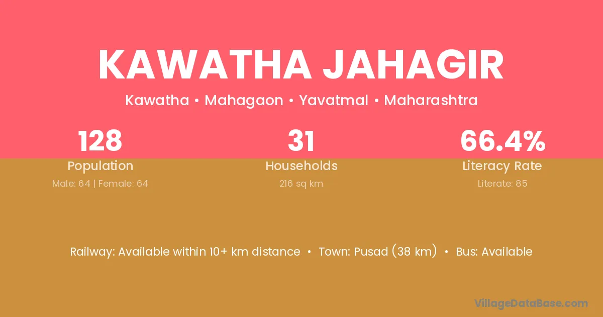 Pusad (38 km) is the nearest town to Kawatha Jahagir village for major economic activities and is located approximately 38 km away.