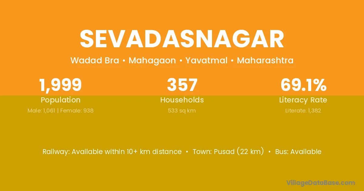 Pusad (22 km) is the nearest town to Sevadasnagar village for major economic activities and is located approximately 22 km away.