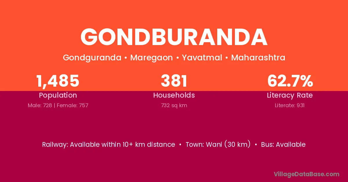 Wani (30 km) is the nearest town to Gondburanda village for major economic activities and is located approximately 30 km away.