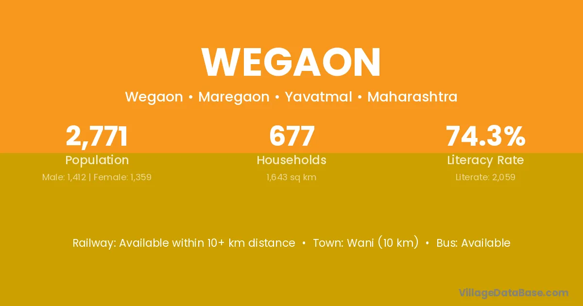 Wegaon village has a total population of 2,771 people, of which 1,412 are males and 1,359 are females.