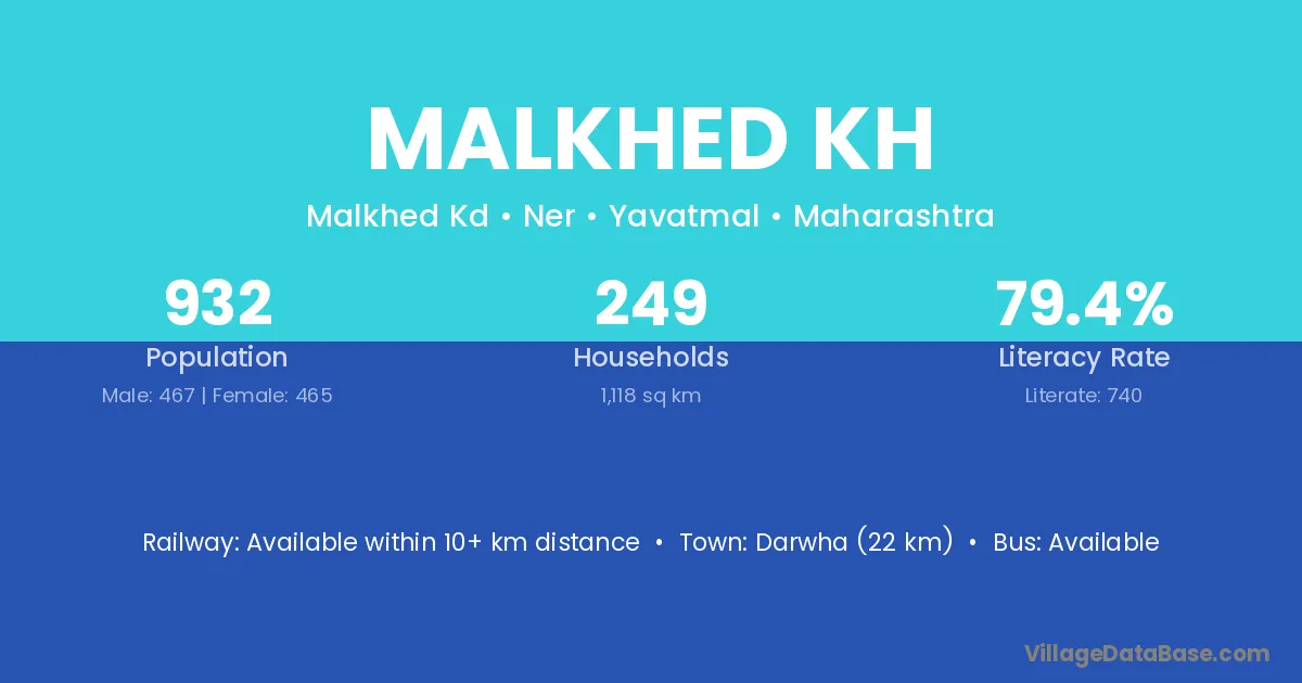Darwha (22 km) is the nearest town to Malkhed Kh village for major economic activities and is located approximately 22 km away.