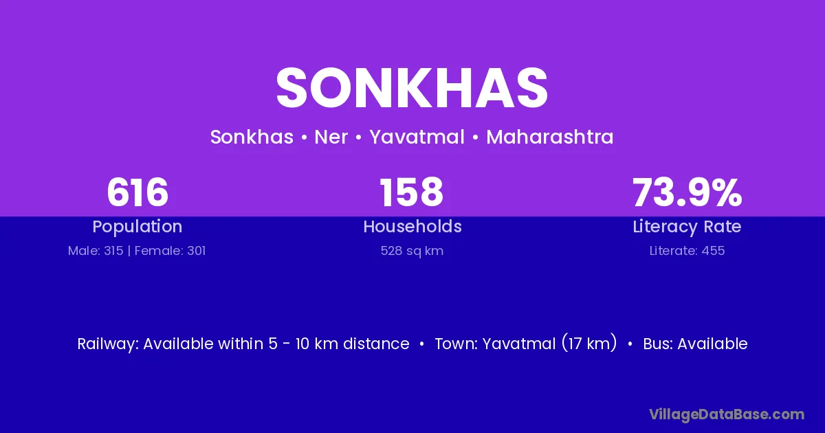 Yavatmal (17 km) is the nearest town to Sonkhas village for major economic activities and is located approximately 17 km away.