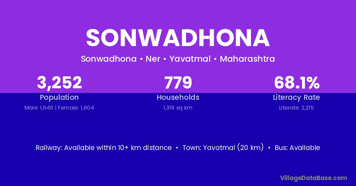 Yavatmal (20 km) is the nearest town to Sonwadhona village for major economic activities and is located approximately 20 km away.