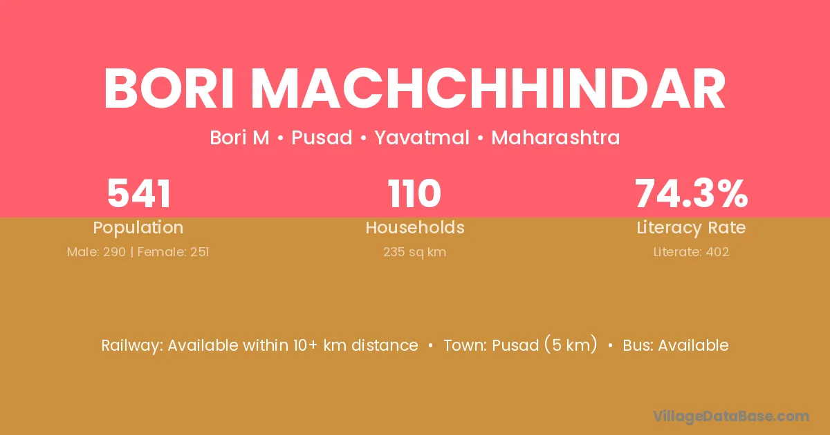 Pusad (5 km) is the nearest town to Bori Machchhindar village for major economic activities and is located approximately 5 km away.