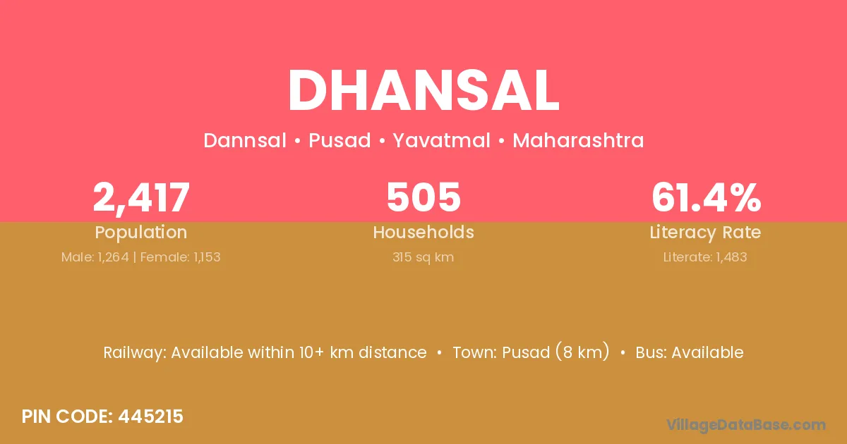 Pusad (8 km) is the nearest town to Dhansal village for major economic activities and is located approximately 8 km away.