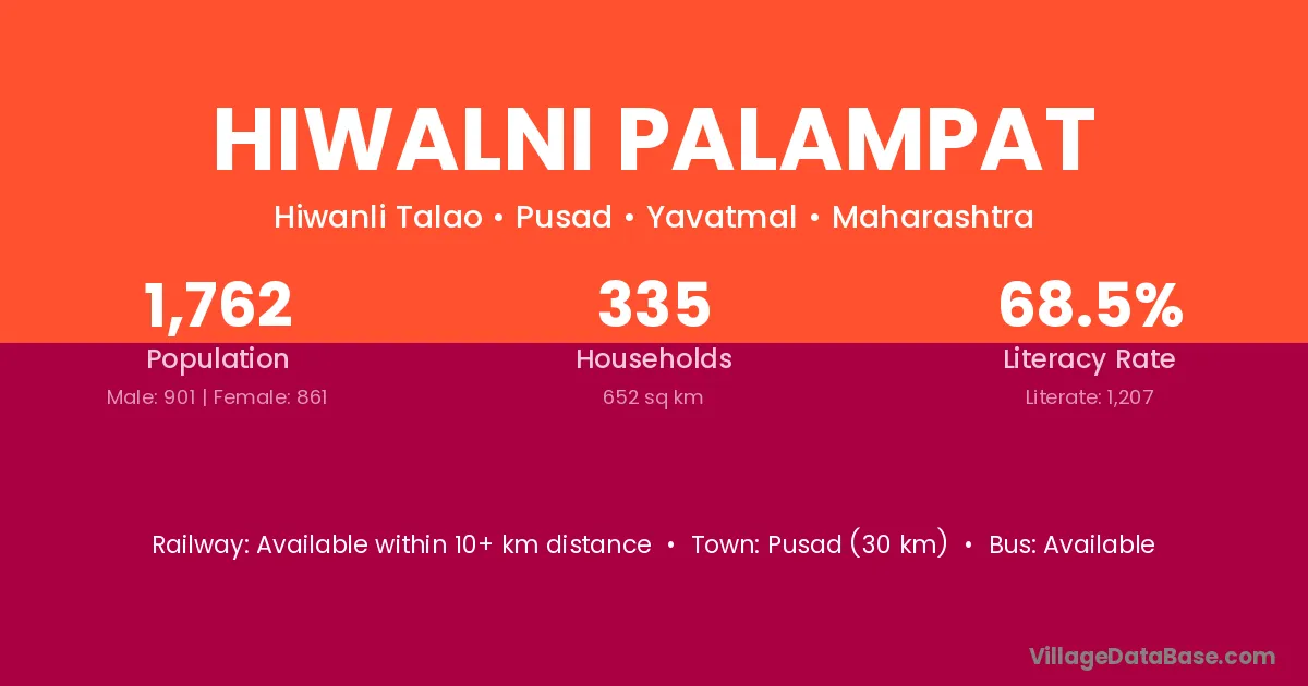 Pusad (30 km) is the nearest town to Hiwalni Palampat village for major economic activities and is located approximately 30 km away.