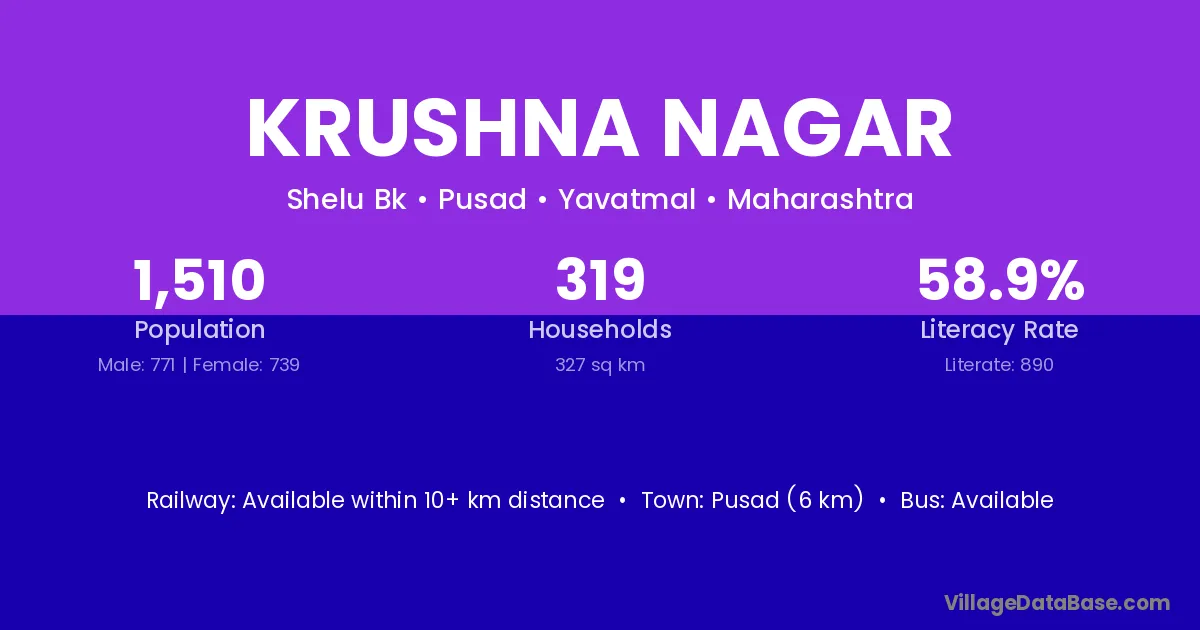 Pusad (6 km) is the nearest town to Krushna Nagar village for major economic activities and is located approximately 6 km away.
