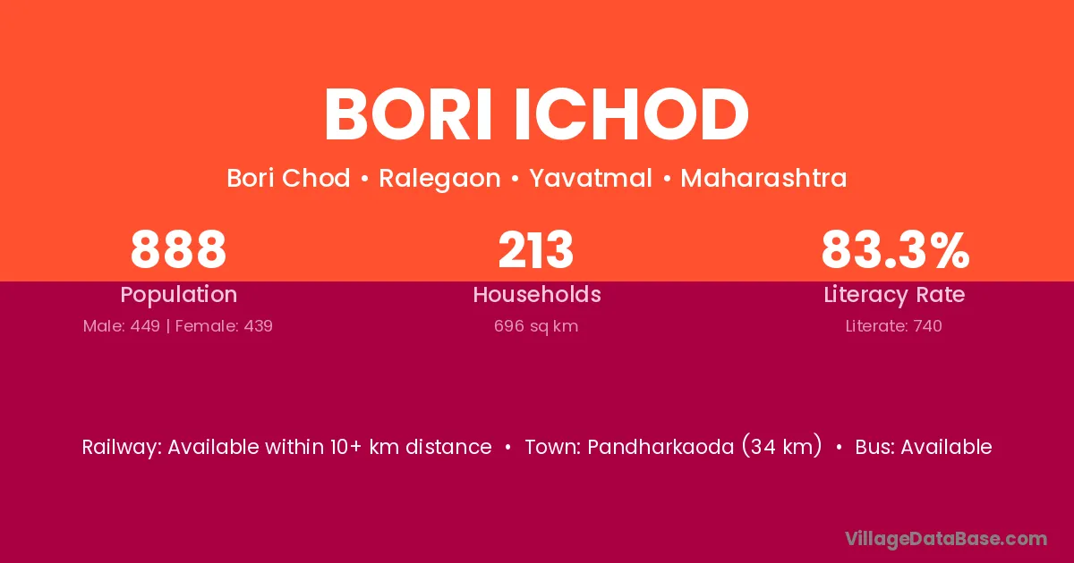 Pandharkaoda (34 km) is the nearest town to Bori Ichod village for major economic activities and is located approximately 34 km away.
