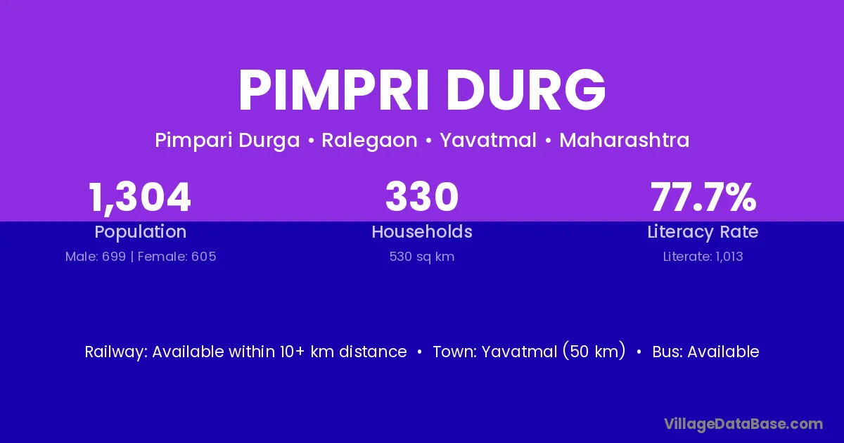 Yavatmal (50 km) is the nearest town to Pimpri Durg village for major economic activities and is located approximately 50 km away.