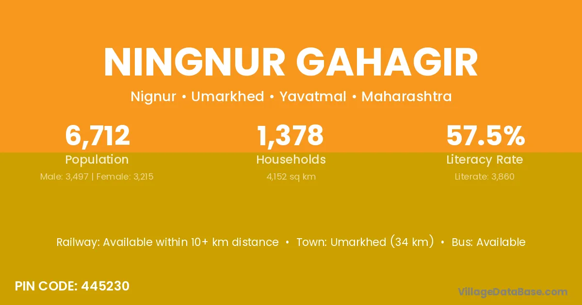 Umarkhed (34 km) is the nearest town to Ningnur Gahagir village for major economic activities and is located approximately 34 km away.