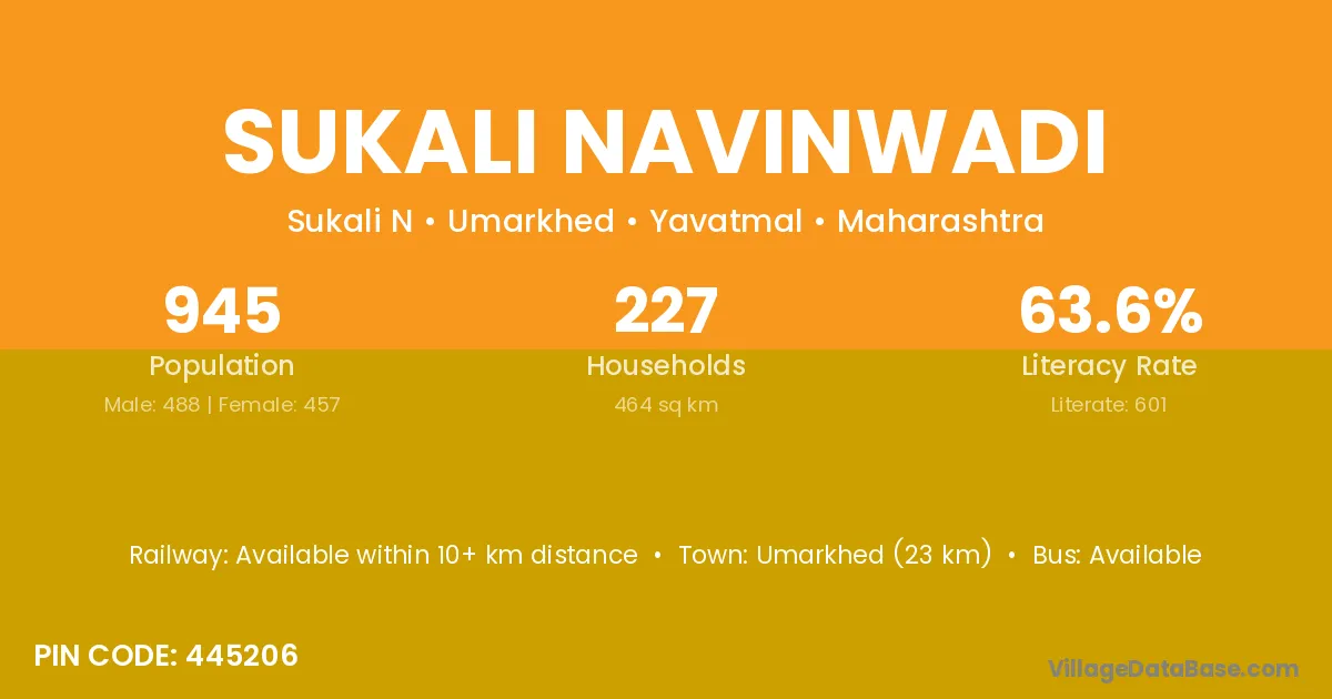 Umarkhed (23 km) is the nearest town to Sukali Navinwadi village for major economic activities and is located approximately 23 km away.