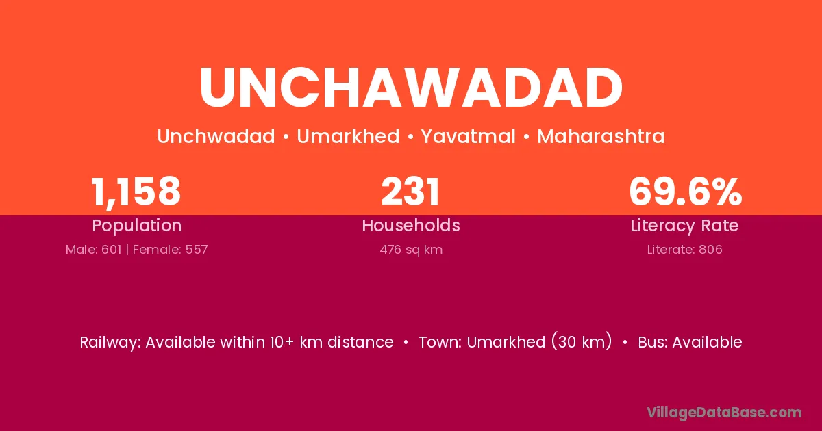 Umarkhed (30 km) is the nearest town to Unchawadad village for major economic activities and is located approximately 30 km away.