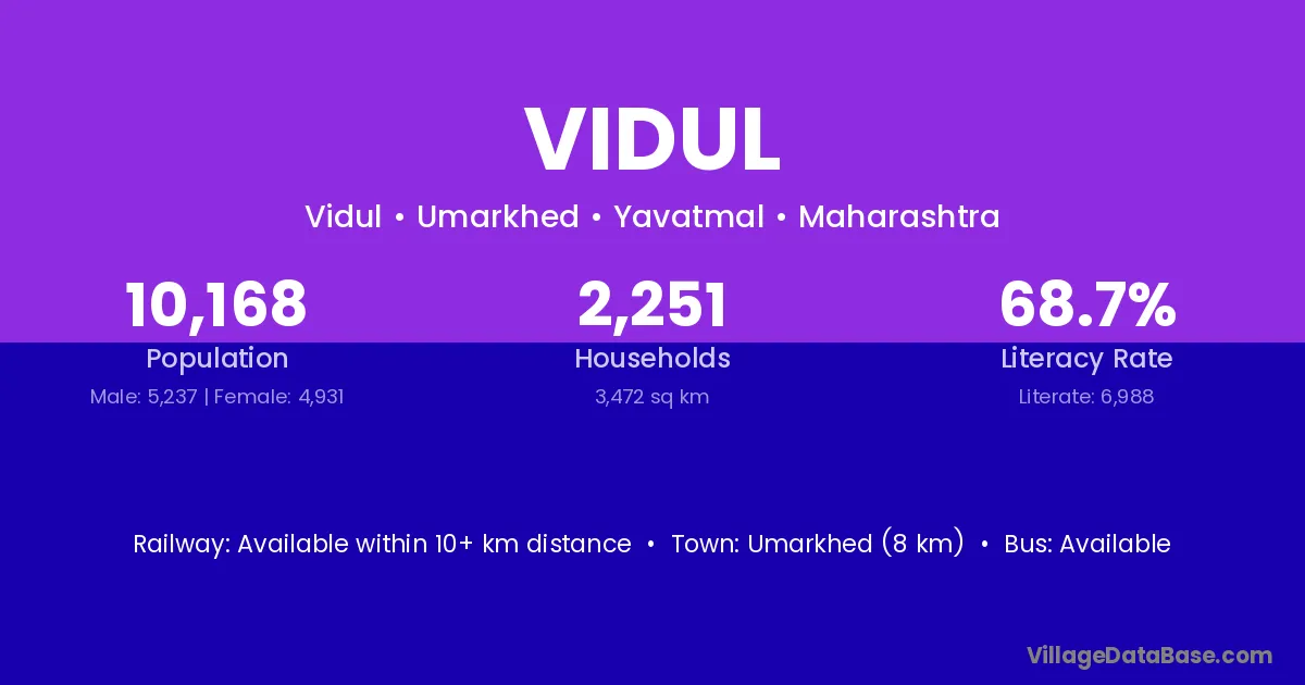 Umarkhed (8 km) is the nearest town to Vidul village for major economic activities and is located approximately 8 km away.