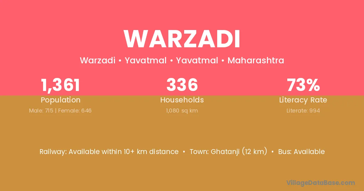 Wani (12 km) is the nearest town to Warzadi village for major economic activities and is located approximately 12 km away.