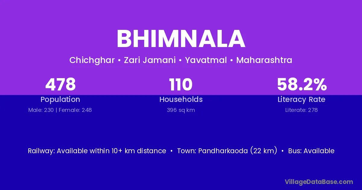 Pandharkaoda (22 km) is the nearest town to Bhimnala village for major economic activities and is located approximately 22 km away.