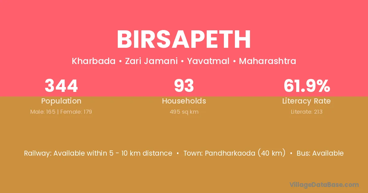 Pandharkaoda (40 km) is the nearest town to Birsapeth village for major economic activities and is located approximately 40 km away.