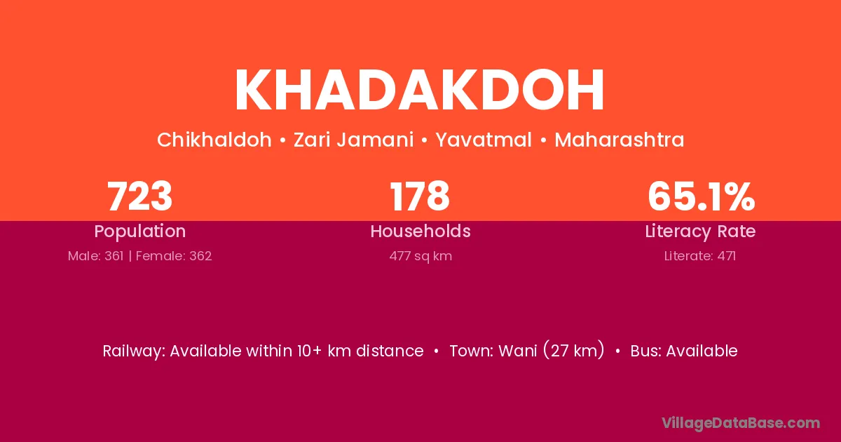 Wani (27 km) is the nearest town to Khadakdoh village for major economic activities and is located approximately 27 km away.