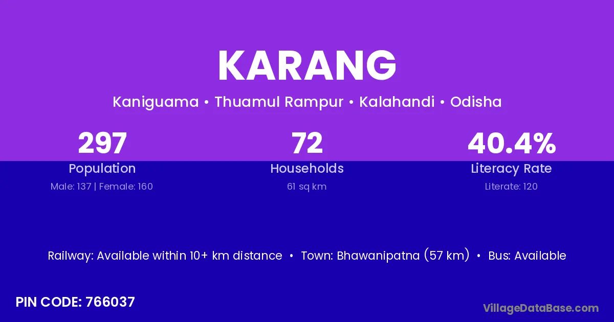 The literacy rate of Karang village is 46.42%. Male literacy stands at 53.83% and female literacy at 38.85%.
