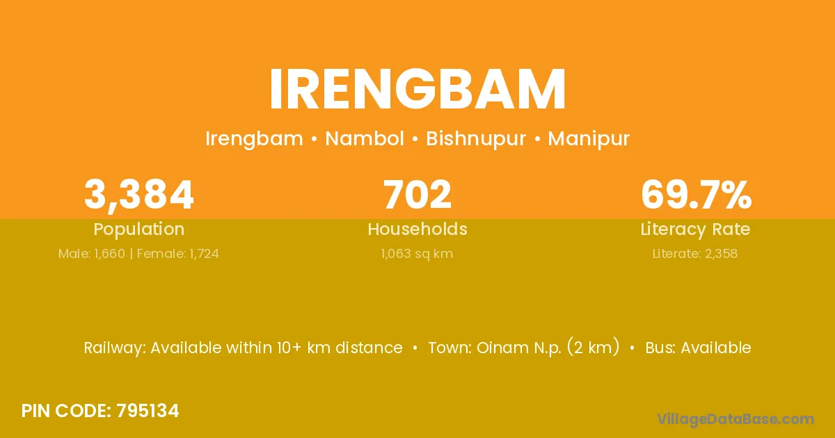 Irengbam village has a total population of 3,384 people, of which 1,660 are males and 1,724 are females.