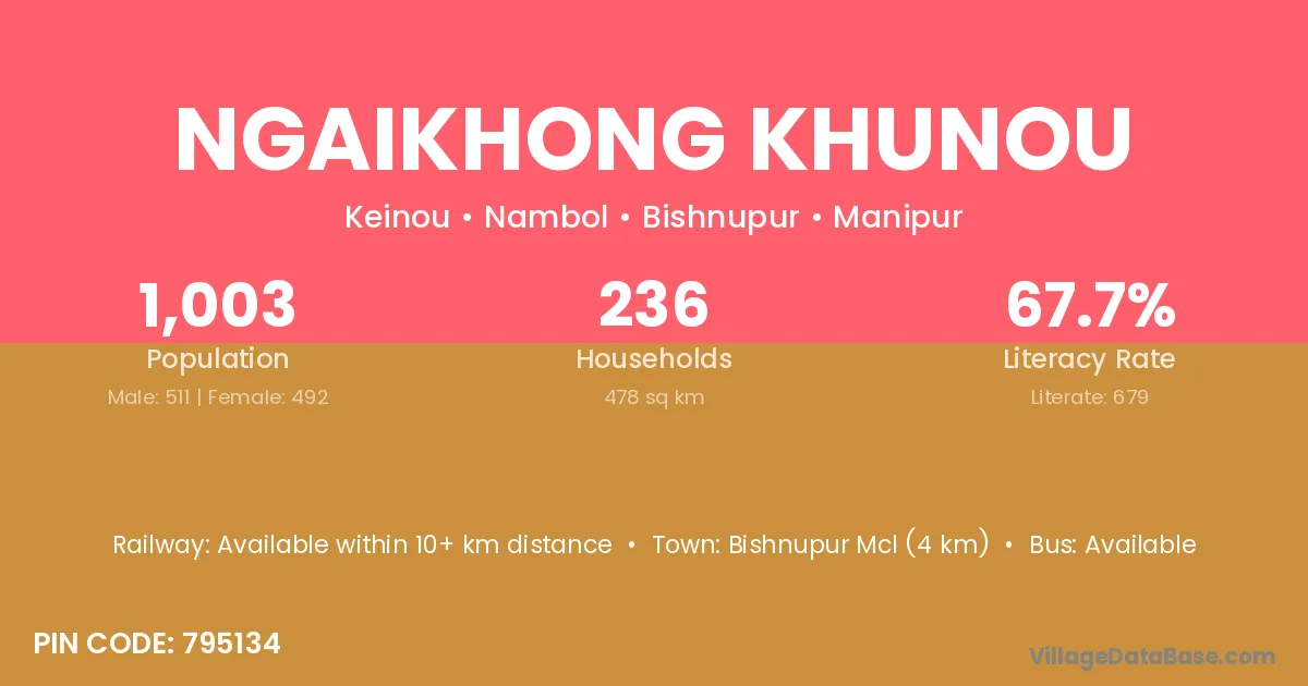 Ngaikhong Khunou village has a total population of 1,003 people, of which 511 are males and 492 are females.