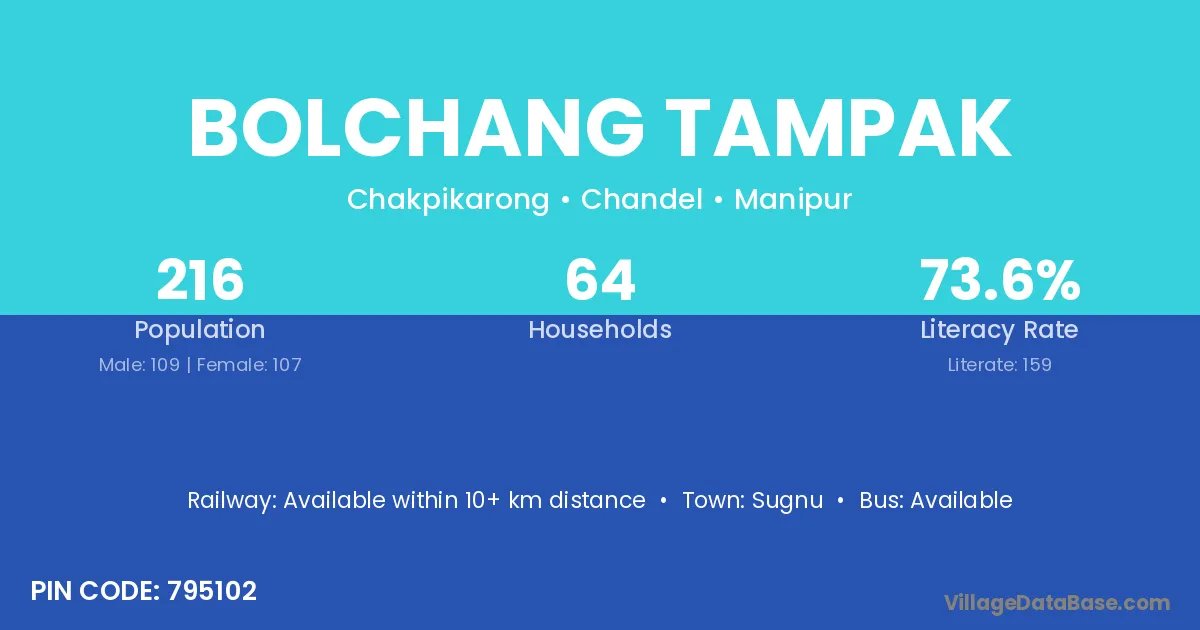 Bolchang Tampak village has a total population of 216 people, of which 109 are males and 107 are females.