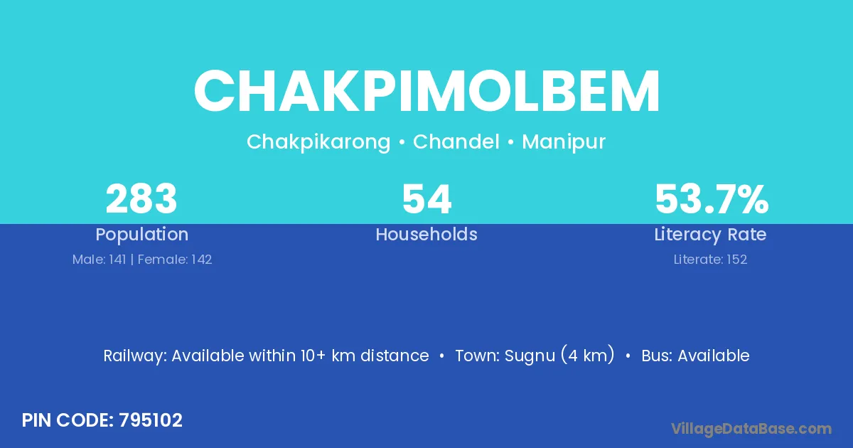 Sugnu (4 km) is the nearest town to Chakpimolbem village for major economic activities and is located approximately 4 km away.
