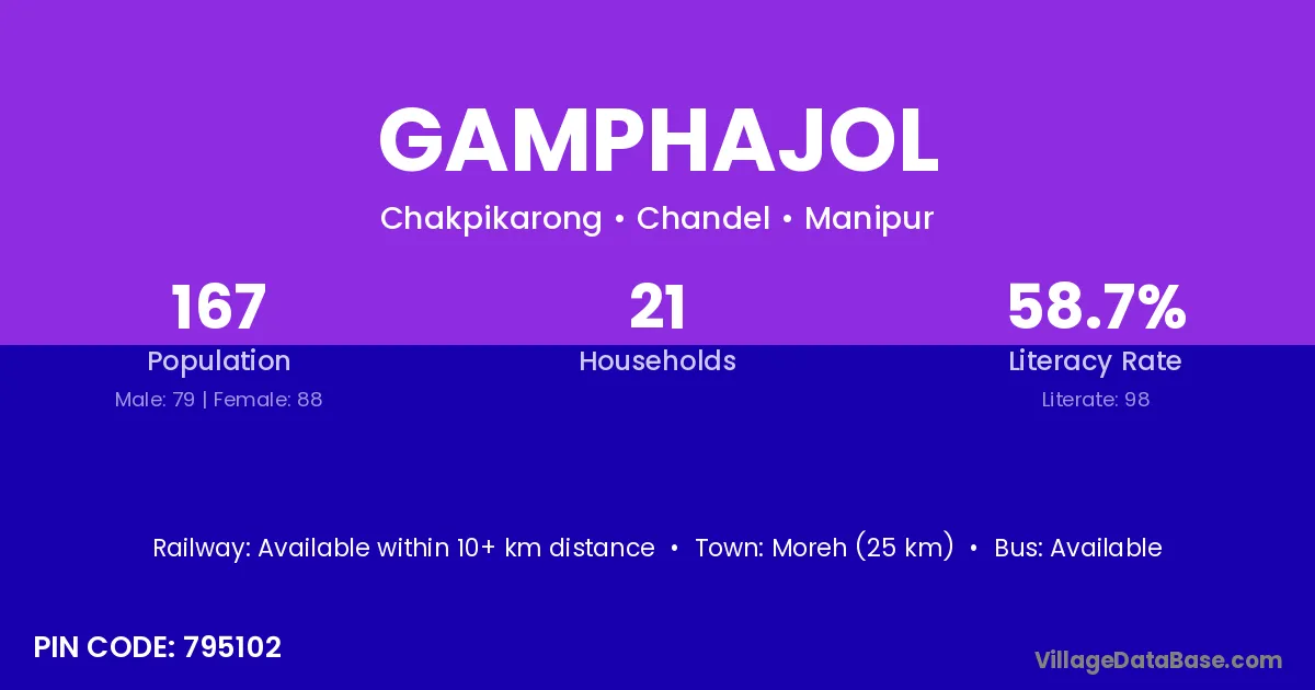 Moreh (25 km) is the nearest town to Gamphajol village for major economic activities and is located approximately 25 km away.