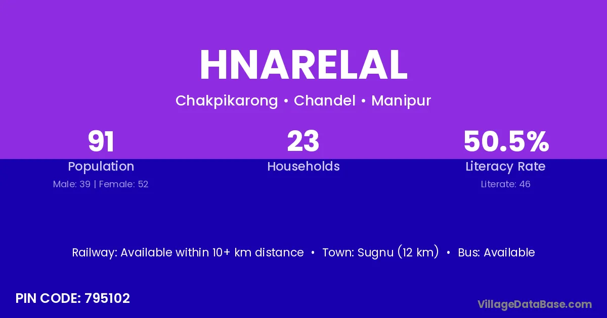 Sugnu (12 km) is the nearest town to Hnarelal village for major economic activities and is located approximately 12 km away.