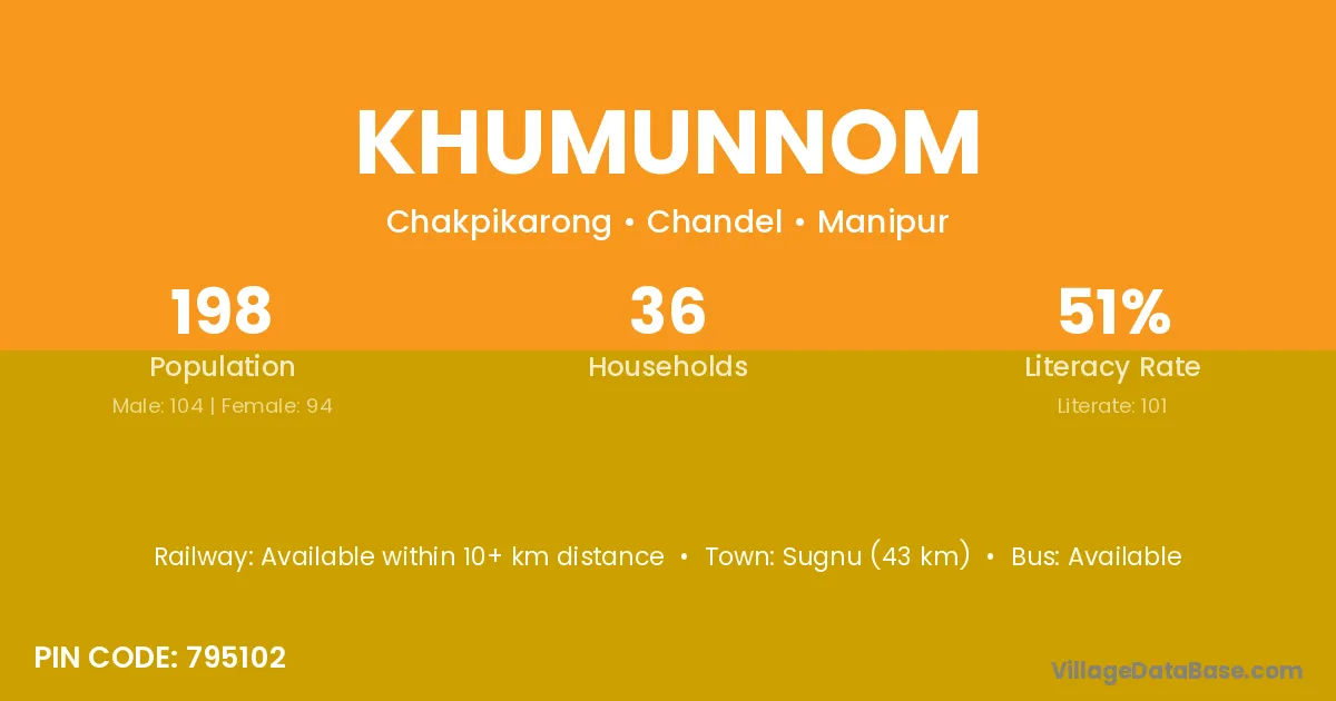 Sugnu (43 km) is the nearest town to Khumunnom village for major economic activities and is located approximately 43 km away.