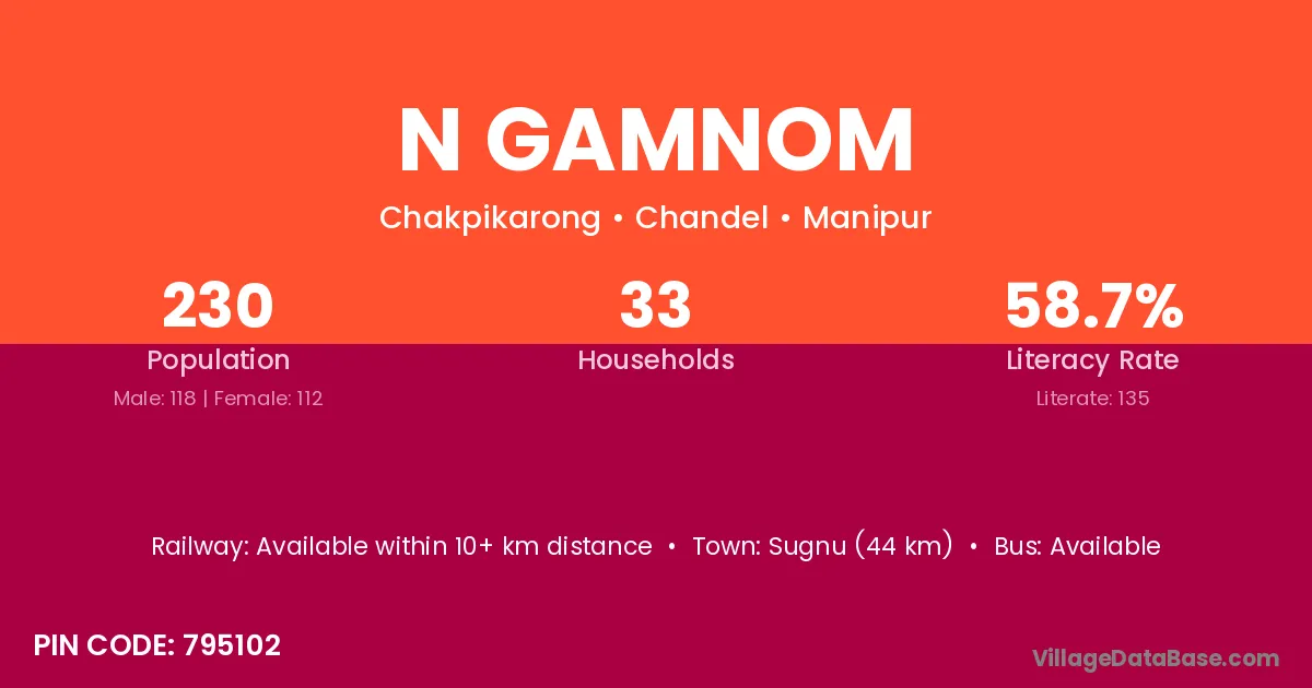 Sugnu (44 km) is the nearest town to N Gamnom village for major economic activities and is located approximately 44 km away.