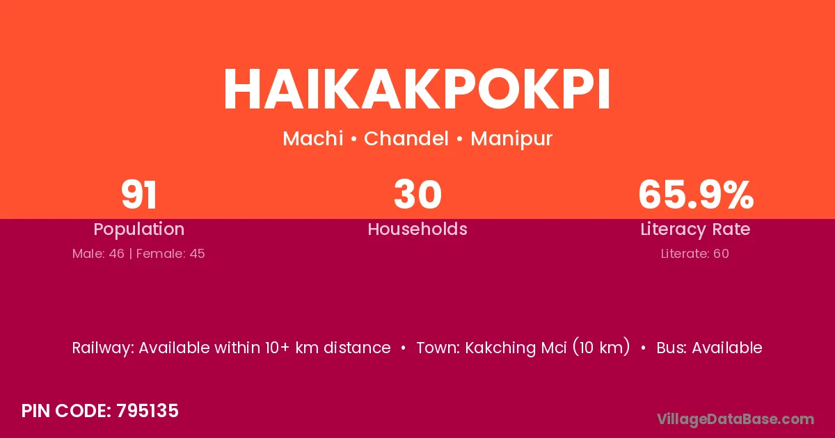 Kakching Mci (10 km) is the nearest town to Haikakpokpi village for major economic activities and is located approximately 10 km away.