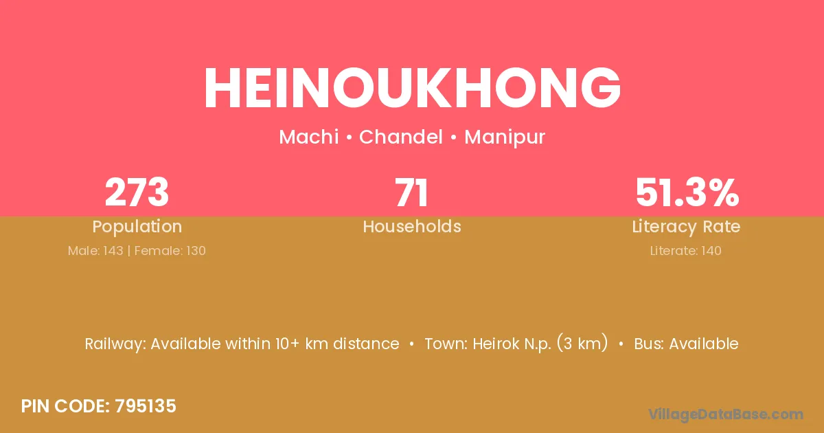 Heirok N.p. (3 km) is the nearest town to Heinoukhong village for major economic activities and is located approximately 3 km away.