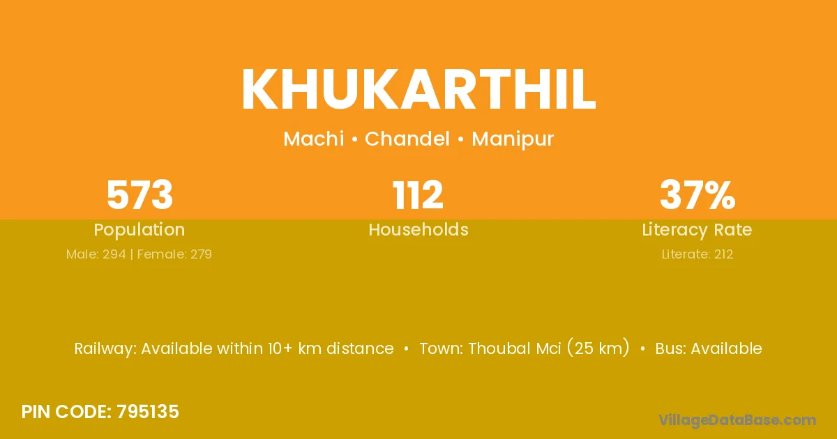 Thoubal Mci (25 km) is the nearest town to Khukarthil village for major economic activities and is located approximately 25 km away.