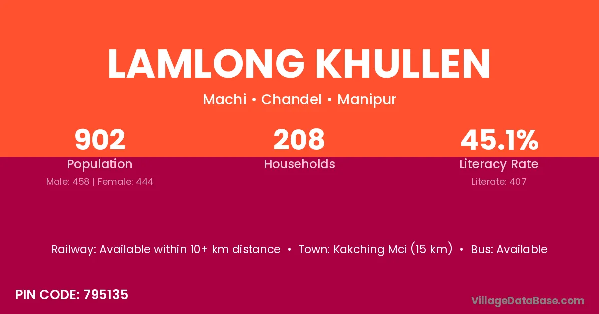 Lamlong Khullen village has a total population of 902 people, of which 458 are males and 444 are females.