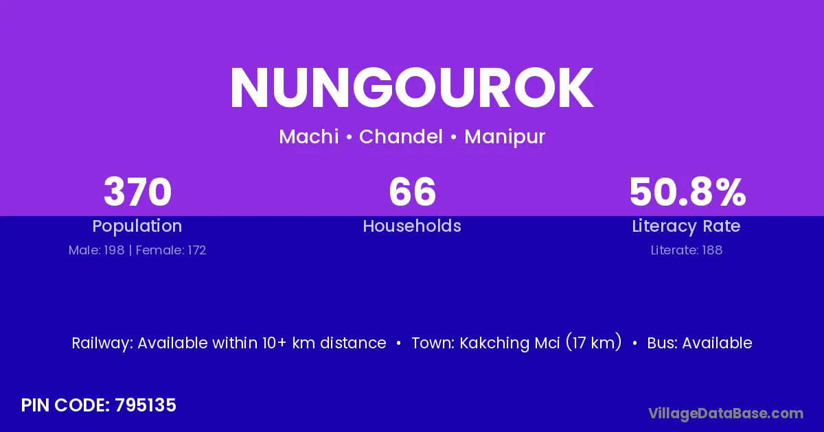 Kakching Mci (17 km) is the nearest town to Nungourok village for major economic activities and is located approximately 17 km away.