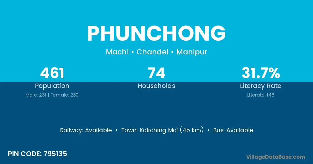 Kakching Mci (45 km) is the nearest town to Phunchong village for major economic activities and is located approximately 45 km away.