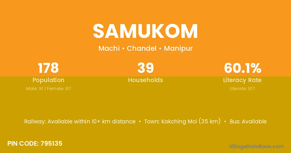 Kakching Mci (35 km) is the nearest town to Samukom village for major economic activities and is located approximately 35 km away.