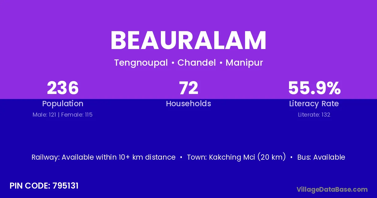 Kakching Mci (20 km) is the nearest town to Beauralam village for major economic activities and is located approximately 20 km away.