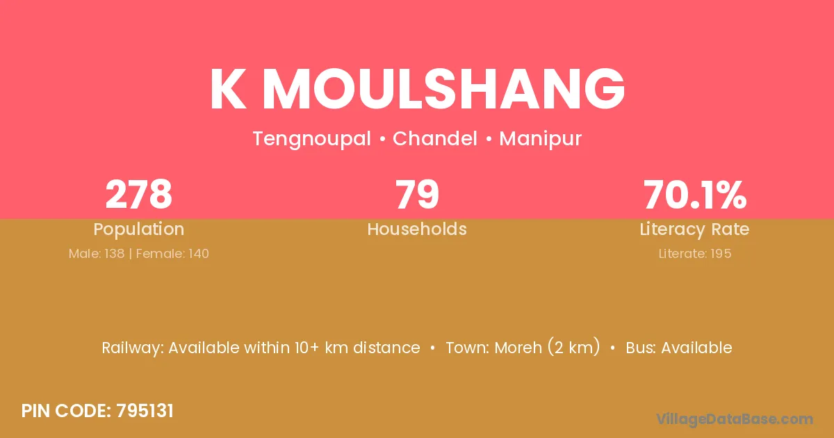 Moreh (2 km) is the nearest town to K Moulshang village for major economic activities and is located approximately 2 km away.