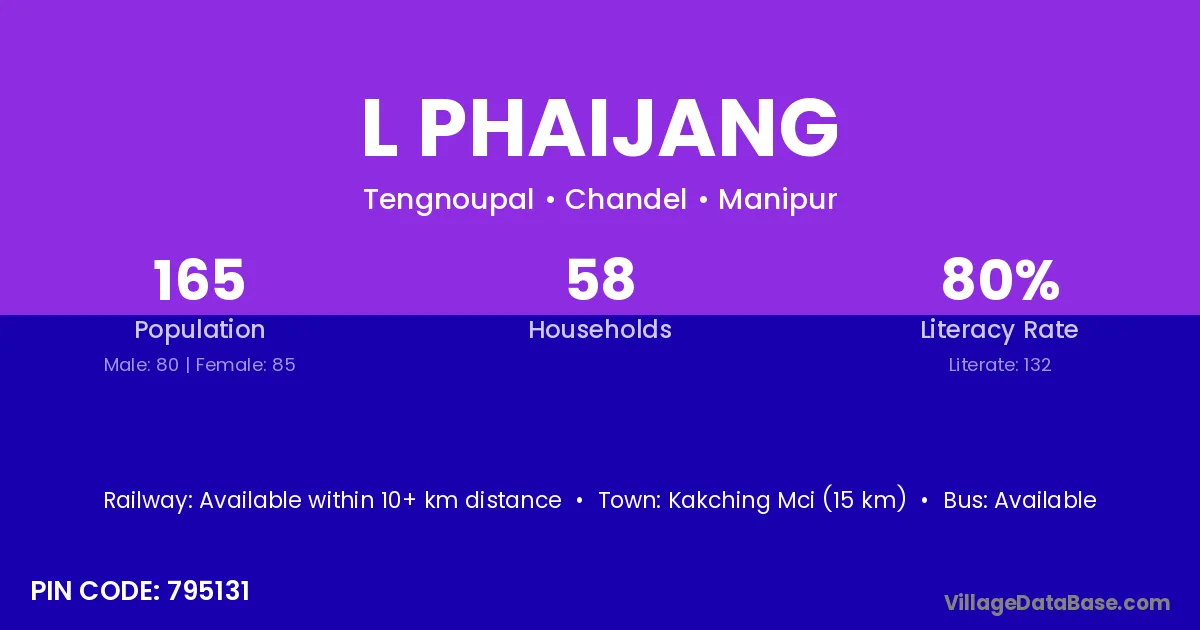 Kakching Mci (15 km) is the nearest town to L Phaijang village for major economic activities and is located approximately 15 km away.