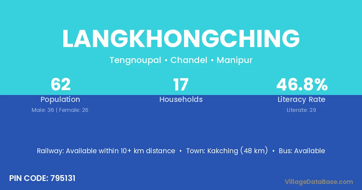 Kakching (48 km) is the nearest town to Langkhongching village for major economic activities and is located approximately 48 km away.